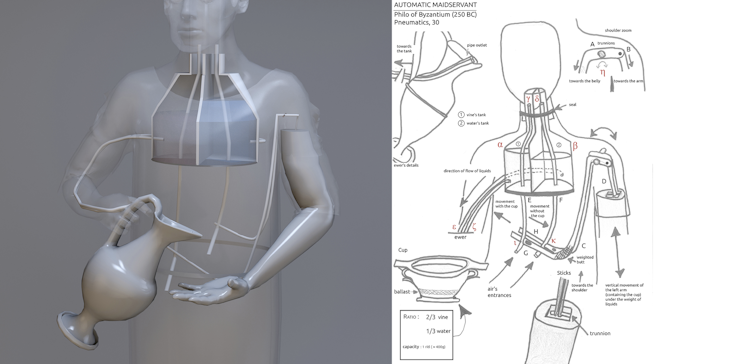 L’automate de la servante automatique distribuant de l’eau et du vin est décrit au paragraphe 30 des Pneumatiques de Philon de Byzance. Cependant, aucun texte grec n’est disponible aujourd’hui pour ce traité, seules les versions arabes sont parvenues jusqu’à nous. Avant de comprendre le fonctionnement du mécanisme, il est utile de préciser qu’il est caché à l’intérieur du corps de la servante et donc invisible pour le public. Le texte nous dit que l’automate est entièrement en cuivre ou en argent, et que la servante est représentée debout, avec une aiguière dans la main droite (voir figure 2).